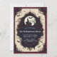 Elegantes Spuk Haus Halloween Einladung entworfen mit einer roten filigranen Grenze und Fledermäuse fliegen über eine schwarze Silhouette eines Spuk Hauses. © 2023 Tabz Jones alle Rechte vorbehalten.