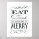 Elegantes Vintages Viktorianisches Plakat für Küche, Bar, Café oder Restaurant. Die Worte lauten "Trink und sei froh!" Stilvoll in Schwarz und Weiß!