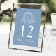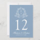 Mit diesen weichen blauen Tischnummern-Karten, die ein weißes, blumengeschmücktes Wappen oben um die Monogramm-Initialen des Paares bilden, entsteht ein beruhigender und eleganter Empfang-Look. Die Tischnummer wird in anmutiger weißer Kalligraphie mit Namen und Datum dargestellt. Ideal für sanfte blaue Hochzeiten, Küstenveranstaltungen oder klassische Frühlingsveranstaltungen. Diese Karte ist 5"x7" groß. Bearbeiten Sie jede Tischnummer individuell und fügen Sie sie Ihrem Warenkorb hinzu, um einen reibungslosen Bestellvorgang zu gewährleisten.