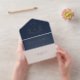 Elegante Hochzeitseinladung in marineblauer Blau, die Ihre Monogramm-Initialen in einem Hochzeitszittel, Ihre Namen, "Empfang zu folgen" und "UAwg" in einem schicken Drehbuch präsentiert, Ihre Einladungsdetails in klassischer Serifentypografie und eine weiße, wegreißende UAWG-Postkarte, alles in Ihrer Wahl von echter Goldfolie, Silber oder Rose. Sie können die Größe des Skripts für längere oder kürzere Namen anpassen, indem Sie auf Wunsch im Entwurfswerkzeug das Format ändern.