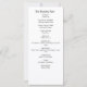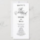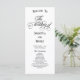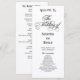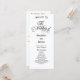 Ein Hochzeitsprogramm mit elegantem weißem Hintergrund mit schwarzem Text und schwarzen Kalligrafieelementen.