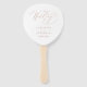 Diese eleganten personalisierten Hochzeitshandventilatoren verfügen über ein Imitat Rose Gold Kalligraphie Skript Typografie Design auf einem einfachen weißen Hintergrund. Personalisieren Sie mit den Braut- und Bräutigamen und dem Hochzeitstag auf der Vorderseite und den Details Ihrer Zeremonie auf der Rückseite. Entworfen von Susan Coffey.