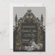 Eleganz in Silber und Schwarz. Dieses Bild zeigt eine Schwarz-Weiß-Abbildung eines Hochzeitsrahmens mit aufwändigen Gold- und Silberverzierungen. Der Rahmen ist mit verzierten Blumenmustern und einem zentralen Bogengang geschmückt. Eine Braut in einem fließenden Gewand, die ein Bouquet hält, steht innerhalb des Rahmens, abseits des Betrachters. Der Hintergrund ist eine strukturierte schwarze Oberfläche, die eine dramatische und elegante Atmosphäre schafft.