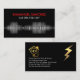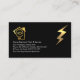 Ein schwarzes Cover verfügt über einen elektrischen Strom, der Ihren Beruf als "Elektriker" anregt, was durchsichtig ist. Oben liegt Ihr Name und Ihre Kontaktdaten. Über dem Blatt befindet sich ein goldener Blitz in der oberen rechten Ecke. Die Kartendetails sind auf der links Seite mit einem Zuhause-Glühbirnen-Logo, das Sie verwenden können, vorbei. Darauf folgen der Firmenname, die Kontaktdaten und eine Slogan-Beschriftung, die Sie ändern können. Das ist eine großartige Karte für Elektriker.