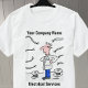 Der Elektriker ist von Kabeln umgeben. Werben Sie mit einem Cartoon-T - Shirt für Ihr Electrical Services-Geschäft. Machen Sie es persönlich, indem Sie Ihren Firmennamen vorne und hinten hinzufügen. Fügen Sie auch Ihre Telefonnummer zur Rückseite hinzu.