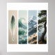 Vier Tafel Naturkunst mit Feder, Welle, Berg und Baum. Boho erdige Dekoration für Wanddrucke und Zeitschriften.