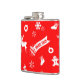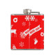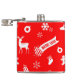 Eine Spirituosenflasche mit einer nahtlosen Wiederholung der Weihnachtselemente - Strümpfe, Lebkuchenmann, Schneeflocken, Rentiere, Weihnachtsschmuck, Kerzen, Weihnachtsbaum und die Worte "Merry Xmas" - in der Abbildung, vor einem roten Hintergrund.