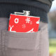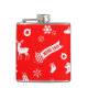 Un flacon d'alcool avec une répétition transparente blanche d'éléments de Noël - bas, gingerbreadman, flocons de neige, rennes, ornements de Noël, bougies, sapin de Noël, et les mots "Joyeux Noël" - en illustration, contre un arrière - plan rouge.