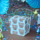 Gastgeschenk-Box in hellblau mit einem niedlichen Cartoon Elefant gezeigt. Passen Sie dieses Element an und fügen Sie Ihren eigenen Text hinzu oder kaufen Sie, wie es ist, und fügen Sie ein hübsches Band.