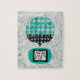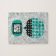 Eine lustige Elefantenillustrierung mit türkisfarbenen Punkten, schwarzem Akzent mit Kreuzen und einem ovalen Aqua - alles auf einem hochstrukturierten weißen Hintergrund.