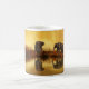 Éléphants à la tasse de café de réflexion de lac sunset
