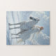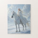 Eine Elfenkönigin mit langen weißen Haaren sitzt rittlings auf einem majestätischen weißen Pferd in einer weiten schneebedeckten Landschaft in diesem digitalen Kunstwerk, das von der Künstlerin Jayne Wilson geschaffen wurde.