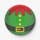 Einer der Elfen des Weihnachtsmannes in ihrem Urlaubsattel grüner Springanzug mit einem roten, jesterähnlichen Kragen. Der Springanzug ist mit goldenen Knöpfen und einem Ledergürtel mit Goldverschluss geschmückt.