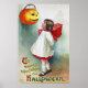 Ein charmantes Vintages Halloween-Poster mit einem jungen Mädchen, das auf einen Jack von O'Lantern schaut, gemalt von der amerikanischen Illustratorin/kommerziellen Künstlerin Ellen Hattie Clapsaddle. com