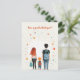 Eine niedliche, farbenfrohe Postkarte mit farbigen Spritzern und einer Abbildung eines Schülers, der bei seinen Eltern Händchen hält.