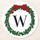 Embossed Look Holly Wreath Monogram Runder Pappuntersetzer