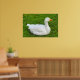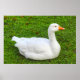 Ein Foto eines weißen Emden Gans, das auf dem Gras sitzt.