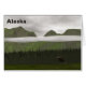 Ein digitales Bild von grünen Nadelbäumen und Bergen in Alaska an einem sehr grauen und bewölkten Tag. Ein BullenElch im Vordergrund verleiht der Szene eine Skala. Es erscheint auch das Textlesen "Alaska".