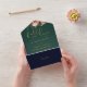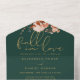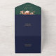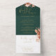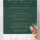 Alles in einer Hochzeitseinladung mit rustikalen Blumen und eleganter goldkalligraphischer Schrift Typografie auf smaragdgrünem Hintergrund. Die Einladung enthält zusätzliche Gastdetails und eine perforierte RSVP-Karte, die für Sie individuell adressiert oder verlassen werden kann, damit Sie die Adressdaten Ihres Gastes handschreiben können. Entwickelt von Thisisnotme©