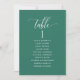 Aidez vos invités à trouver leur table avec cette élégante carte moderne de plan de salon avec les noms des invités. Cartes recto-verso pour que les clients puissent chercher leur nom à l'avant ou à l'arrière. Libérez de l'espace tout autour en vous donnant la liberté d'utiliser des clips ou un trou de perforation pour accrocher des écrans, ou d'utiliser le support/cadre de table. Émeraude arrière - plan vert et texte blanc. Détails de calligraphie manuscrite moderne. Plusieurs options de couleur. Ayez tous les numéros de table dans la même couleur ou mélangez les couleurs selon le thème de couleur de votre événement.