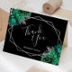 Diese elegante, moderne Hochzeitskarte mit einem silbernen geometrischen Rahmen, der mit smaragdgrünen Blume und silberfarbenen Imitaten Glitzer auf schwarzem Hintergrund dekoriert ist. Die Worte "Danke" erscheinen in skurrilen, silbergrauen Handschrift, die Namen des Paares unten kursiv.