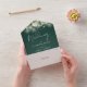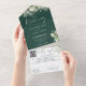 Alles in einer smaragdgrünen Hochzeitseinladung mit botanischem Grün, Lichtern und eleganter Typografie. Die Einladung enthält eine perforierte RSVP-Karte mit Ihrem Hochzeitswebseiten QR Code und Details. Entwickelt von Thisisnotme©