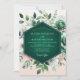 This nature-inspired design features a deep emerald green palette complemented by soft peach and white tones. The arrangement showcases a variety of botanical elements, including echeveria succulents, eucalyptus leaves, and delicate white roses. A soft watercolor wash provides a subtle backdrop to the dense greenery and floral accents.