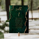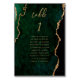 Diese moderne Hochzeitskarte mit smaragdgrünem Aquarellhintergrund mit vergoldetem Imitat-Glitzer besticht durch ihre elegante Tischnummer. Das Wort "Tabelle" erscheint in goldfarbenem Schriftzeichen. Fügen Sie die Namen Ihrer Gäste hinzu, die jeder Tabelle zugeordnet sind.