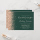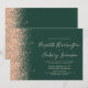 The left-hand edge of this elegant modern wedding invitation features a peach faux glitter border. The customizable text combines peach handwriting, copperplate and italic fonts on an emerald green background. The reverse side features a matching green and peach glitter design.