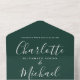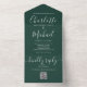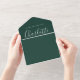 Alles in einer Hochzeitseinladung mit elegantem Schriftnamen und Monogramm-Initialen auf smaragdgrünem Hintergrund. Die Einladung enthält eine perforierte RSVP-Karte mit Ihrem Hochzeitswebsite QR Code. Entwickelt von Thisisnotme©