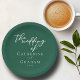Diese smaragdgrüne runde Hochzeitsplatte bietet klassische weiße Schriften für ein Paar, das in einem Wald oder einem anderen Naturort heiraten möchte. Feiern Sie Ihre Liebe mit dieser ruhigen Farbe und koordinieren Sie diese Dekoration mit unserer minimalistischen Typografie-Kollektion.