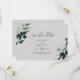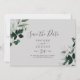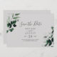 Diese smaragdgrüne, graue, horizontale Save the Date Karte ist perfekt für eine Hochzeit. Das elegante und dennoch rustikale Design besticht durch stimmungsvolle, dunkelgrüne Blätter und Eukalyptus mit einem modernen böhmischen Waldgefühl.