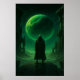 A mysterious hooded figure stands beneath a glowing green planet, creating a surreal and atmospheric fantasy scene. Perfect for lovers of moody, dramatic, and otherworldly artwork.