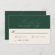 Design moderne et chic avec un bord, cette carte de réponse mariage minimale moderne présente de beaux monogrammes de script de calligraphie de la mariée et du marié sur des coins alternatifs au dos de la carte. Personnalisez le modèle de texte avec votre date RSVP requise et les initiales monographiques de la mariée et du marié sur le côté arrière. Vous pouvez déplacer vos initiales légèrement à gauche ou à droite, vers le haut ou vers le bas afin de les adapter à leur meilleur affichage dans ce format de conception. Les monogrammes sont les meilleurs lorsqu'ils se détachent légèrement des bords. Montré ici en vert émeraude et beige d'ivoire avec initiales de calligraphie sur le dos.