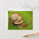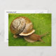 Auf dieser Postkarte befindet sich eine Gartenschnecke, die aus seiner Muschel auf einem grünen Blatt entsteht. Er ist ein terrestrischer Gastropodmuschel mit einer braunen und beigen Muschel im klassischen Spiralmuster. Seine Tentakel haben jeweils ein Auge am Ende und zeigen nach vorn, während er herausfindet, wohin er gehen soll, durch seinen kräftigen Muskelfuß vorangetrieben.