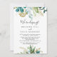 Diese tropische, goldgelbe, grüne Empfang-Karte eignet sich hervorragend für ein Party nach dem Ausstieg. Das Design zeichnet sich vor allem durch handbemaltes, grünes Blattwerk in Aquarell und goldene Blume aus, das einen eleganten geometrischen Rahmen schmückt. RSVP Karten werden separat verkauft.