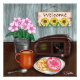 Digitale Kunst: Vintage Szene mit Begrüßungsschild, einer Vase aus rosa Blume, einer warmen Tasse Kaffee und zwei Donuts mit Vintagem Radio im Hintergrund.