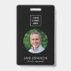 badge d'employé noir moderne avec photo, code QR, logo de l'entreprise, nom et titre de l'employé. Vous pouvez facilement le customiser avec vos détails d'affaires.