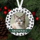 Personnalisez ce design empreinte de patte de décoration de Noël avec votre nom de chat (ou de chien) et une photo préférée de votre membre de la famille de la fureur. L'Arrière - plan comprend un motif empreinte de patte moderne noir et blanc avec une bande d'accent vert chasseur.