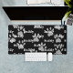 Tapis de bureau personnalisé noir et blanc avec le nom de votre chien. Le design présente des empreintes de pattes en gris et du texte en blanc.