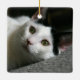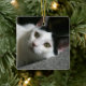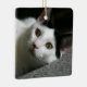 Photo du visage d'un chat noir et blanc aux beaux yeux verts.