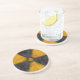 Dessous de verre de grès avec un symbole jaune et gris affligé de rayonnement.