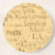 Dessous de verre d'amusement, faits dans un beige, avec le texte brun clair partout, énumérant de grandes villes du monde. De grands dessous de verre pour le repaire, la pièce de jeu, ou la chambre familiale. Perfectionnez pour ajouter un morceau de conversation à votre table basse et faites un cadeau gentil.