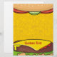 Illustration de dessin animé Cheeseburger. Les aliments indésirables entourent les icônes jaune motif arrière - plan. Texte personnalisé.