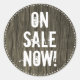 Ce design de vente d'autocollants ronds comporte le message "ON SALE MAINTENANT!". Il est également décoré d'un arrière - plan à l'allure de faux bois. Il pourrait être utilisé dans un magasin de détail pour marquer des marchandises dont le prix a été réduit.