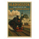 Retro Vintage Reise Poster von Wladiwostok, Russland. Vordergrund: Die typische transsibirische Dampflokomotive in klassisch schwarz und rot, die Dampfwolken explodieren dramatisch. Der Zug fährt nach vorn und kommt stolz am Wladiwostok-Bahnhof an
