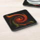 Cet ensemble de dessous de verre de liège de beaux-arts comporte un motif circulaire de tourbillon dans des couleurs brillantes de rouge, d'orange, de vert, de jaune, de brun et de noir. La conception abstraite est une vue impressionniste de l'énergie de tourbillonnement de tourbillon de la création.