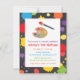 Ayez une célébration colorée de fête d'anniversaire en organisant une fête d'anniversaire de peinture à un studio d'art ou même à votre maison ! Cette invitation de partie de peinture a un pinceau et une palette d'arts avec un bon nombre d'espace blanc pour personnaliser vos détails de partie. À l'arrière-plan est les flocs aléatoires de peinture au-dessus d'un arrière - plan noir. Il communique un sens d'amusement décontracté pour les enfants ! Placez leur créativité libre !