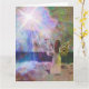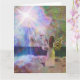 Bild eines Engels stehend auf einem Strand, aufwärts starrend an, in das Strahlen der Sonne auf einer Grußkarte passend für irgendeine Gelegenheit.