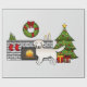 Desteis originelle Cartoon Illustration einer niedlichen englischen Creme Golden Retriever Rasse Hund. Der Hund ist in einem festlichen Wohnzimmer mit Kamin untergebracht. Der Kamin ist eingeschaltet und hat zwei rote Strümpfe an der Seite. Auf dem Kamin befindet sich ein grüner Kranz, der mit einem roten Bogen und gelben Kreisen als Lichter dekoriert ist. Auf dem Mantel stehen drei kleine Dreiecksbäume, die ebenfalls mit gelben Kreisen als Lichter geschmückt sind. Auf dem Mantel befinden sich auch zwei beige Kerzen. Neben dem Kamin befindet sich ein festlich grüner Weihnachtsbaum mit zwei Geschenken. Der Weihnachtsbaum ist mit roten und gelben runden Ornamenten und einer grauen Garage dekoriert. Auf dem Baum ist ein gelber Stern.